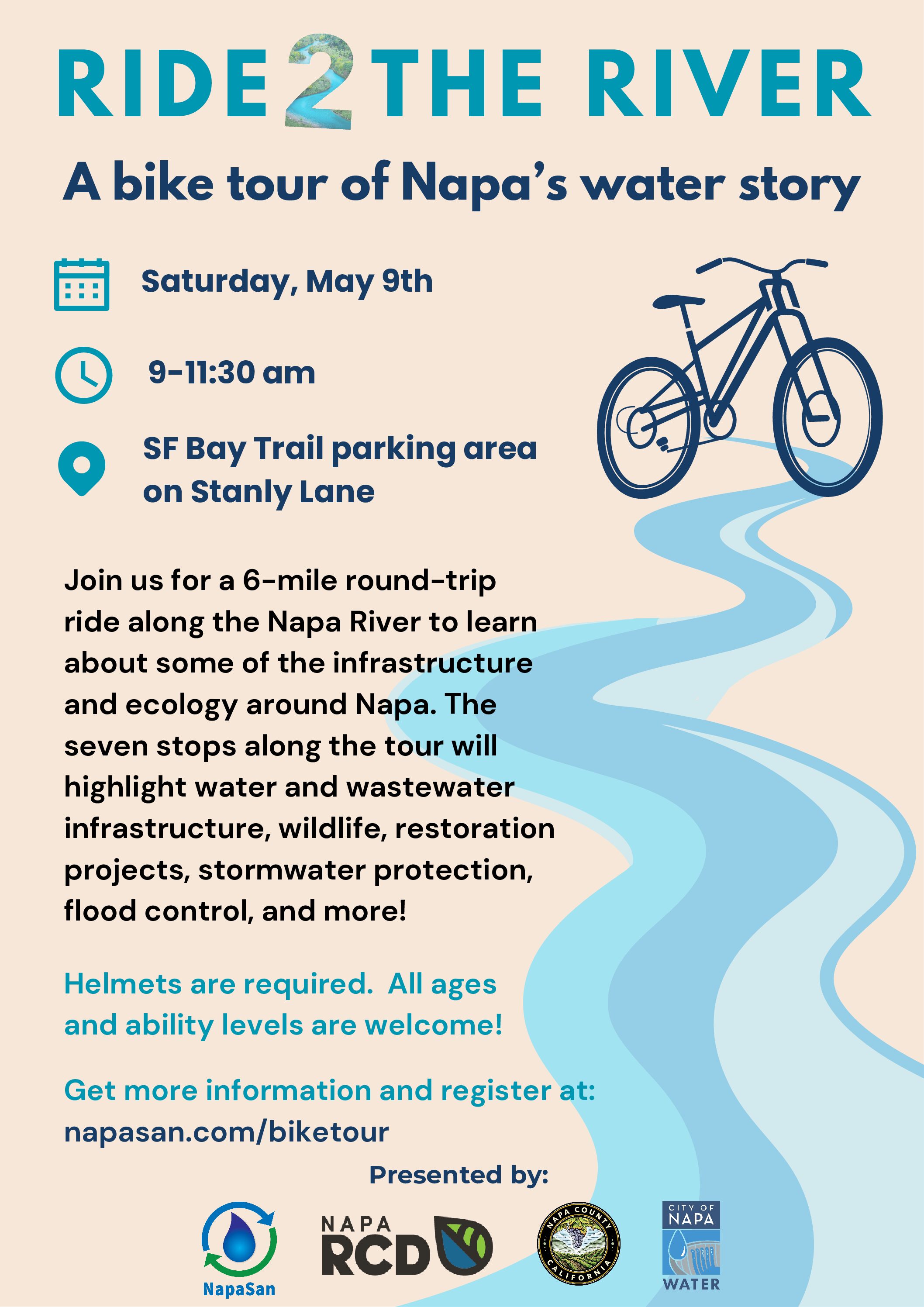 A Bike Tour of Napa’s Water Story Saturday, May 9th • 9-11:30am Join us for a 6-mile bike ride along the Napa River to learn about some of the infrastructure and ecology around Napa. The eight stops along the tour will highlight water and wastewater infrastructure, wildlife, restoration projects, stormwater protection, flood control, and more! […] ...