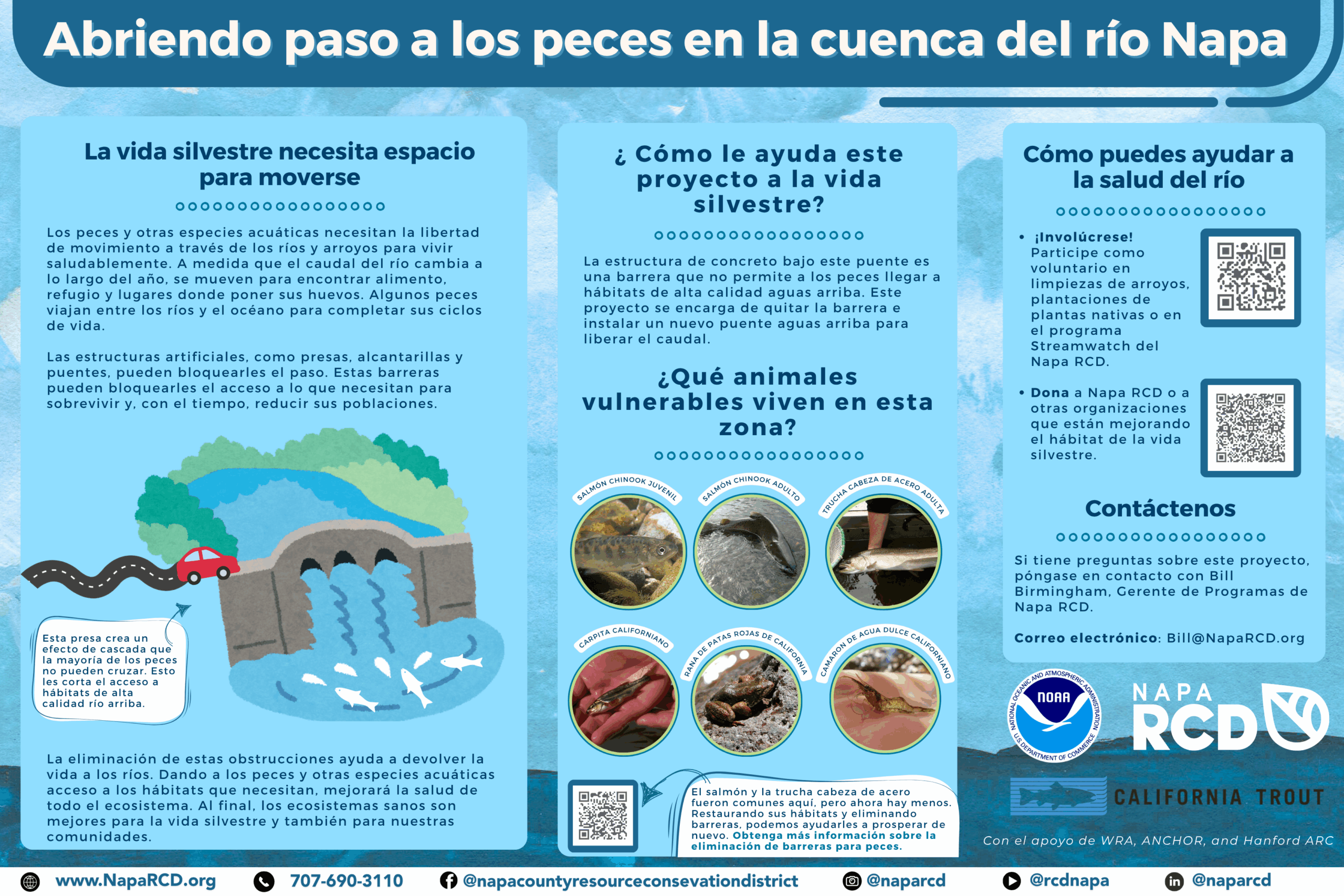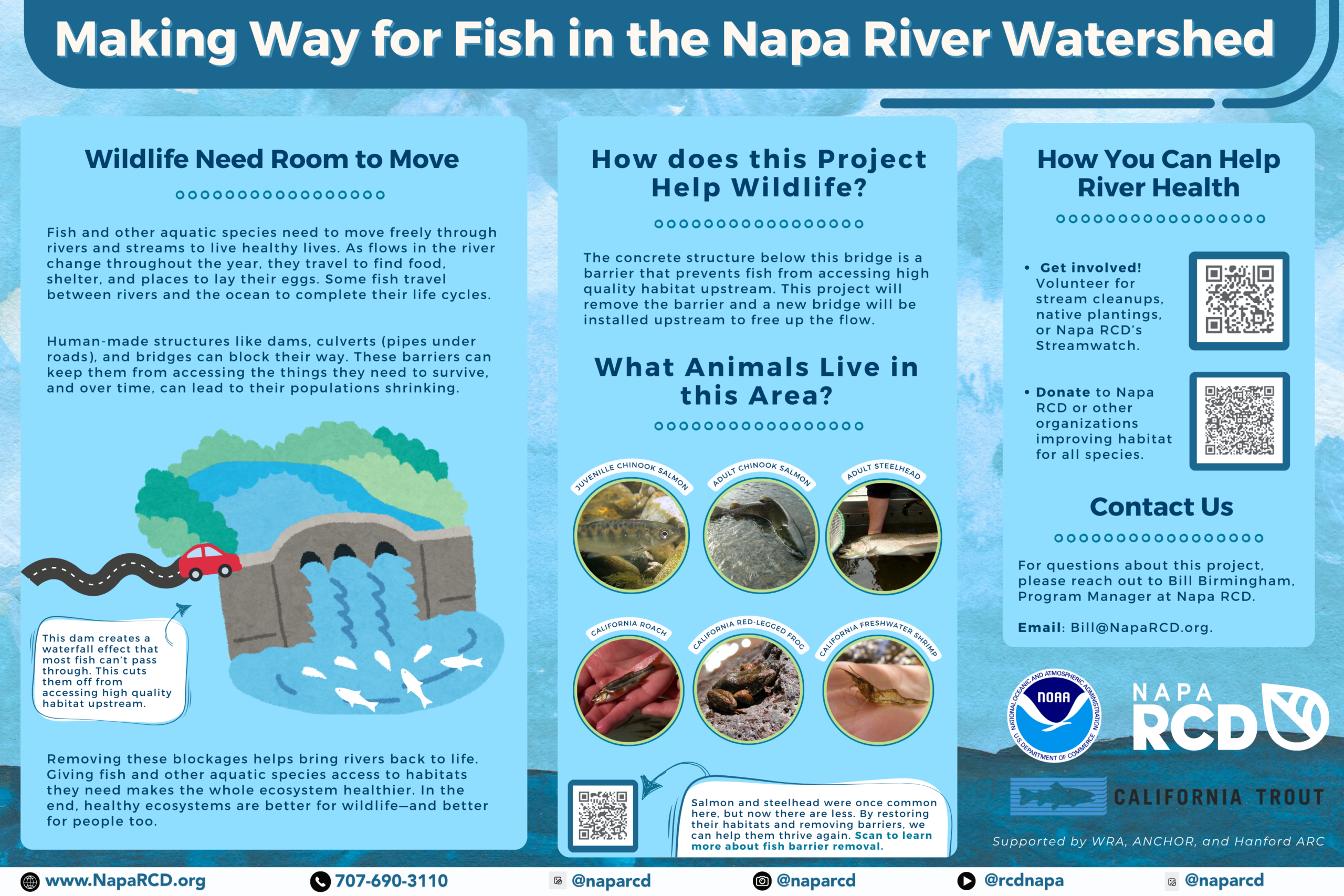 In 2024, Napa RCD was awarded $6.7 million by NOAA  and $900,000 from the California Wildlife Conservation Board to help restore access to healthy habitat for migratory fish across the country The project is currently focused on addressing five high-priority fish passage barriers in the Napa River watershed.